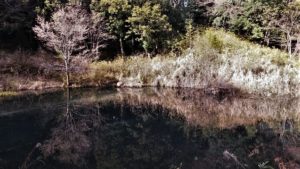 藻が茂って青くなった池に、枯れ木やススキが見事に反転して綺麗~✨
