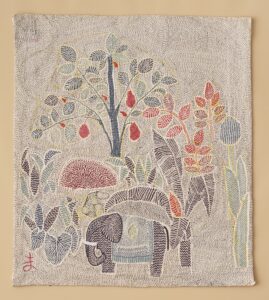 布地などに針で糸を刺し、縫い重ねる手法によりかたちづくられる多彩な