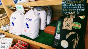 (「直売所 かたくり」に並ぶ栄村産コシヒカリの新米)