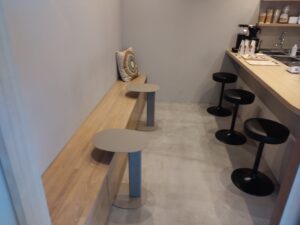 照明も明るすぎず、淡いグレーの壁に木の温かみを感じられるインテリアでまとめられており、全体的に落ち着いた雰囲気になっています。