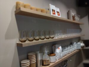棚にはコーヒーカップだけでなく、夜のスナックで使用するシャンパングラスなども並べられています。