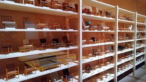 ウェグナーが愛し手元に置いた椅子を、邸宅ごとミニチュアにしたかと思えば、