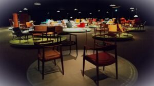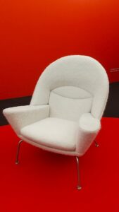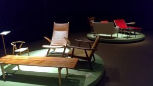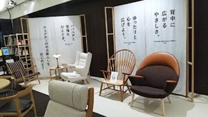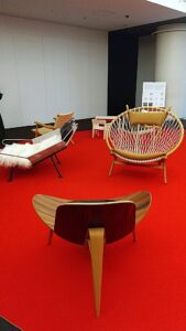 会場出口には、芸術的でありながら、座り心地も秀逸なウェグナーの椅子に実際に座れるコーナーも!
