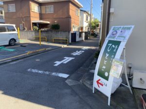 「ひととき」さんの緑色の看板が見えてきます。
