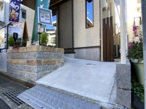 車いす・ベビーカーの方も入れるようにスロープが作られ、階段にも手すりが設置されておりステッキをお使いの方も、