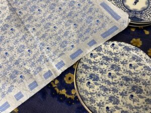 一枚一枚手作業転写される技法を用いつつ、現代的なモチーフを取り入れて骨董の様に見せつる柄が描かれています。