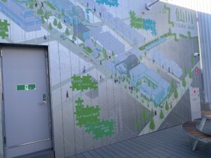 ひと際目を引くのが壁に描かれた仙川の街が描かれた壁画で、