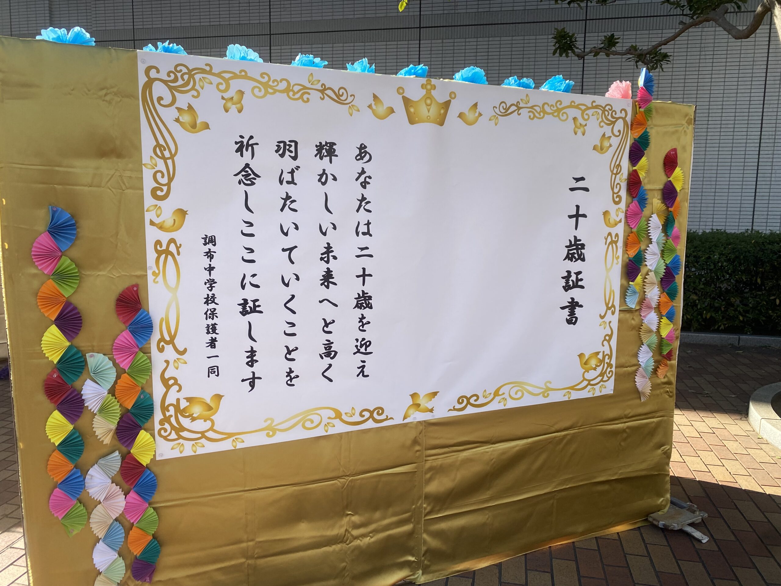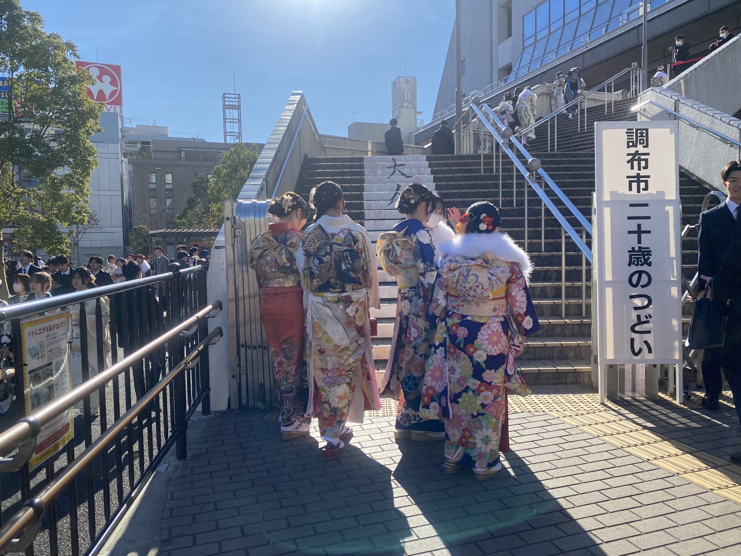 また、今年も駅前再開発の影響で、調布市内中学校の二十歳を祝う会(新成人を祝う会)はグリーンホールの1階小ホールと調布市役所前庭での開催となりました。
