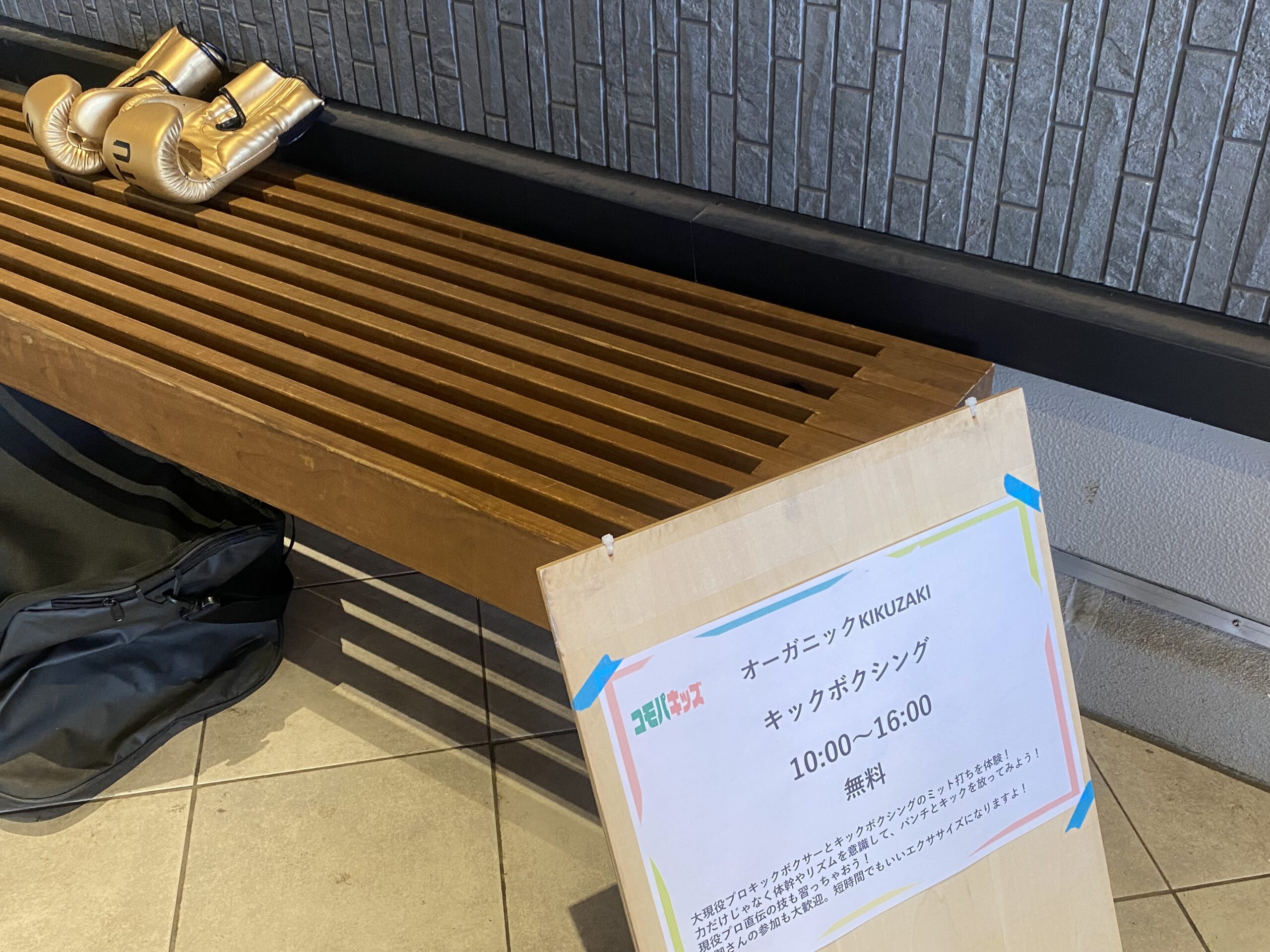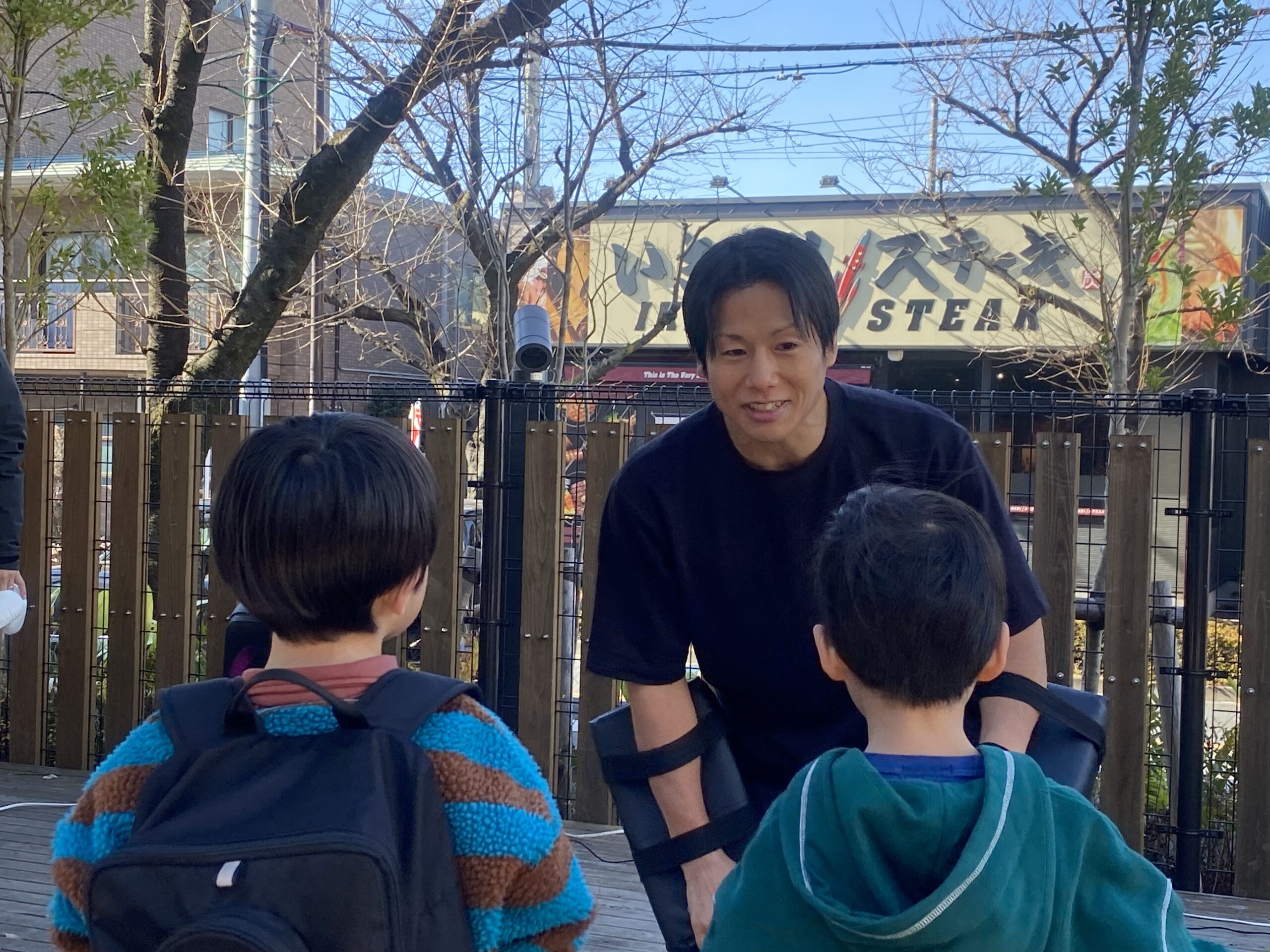 ボクシングの体験企画で、現役のトレーナーさんに子どもさん達が挑戦していました。