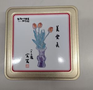 毎年変わる金色の角缶ですが、実篤の淡彩画(チューリップ美愛眞)あしらえました