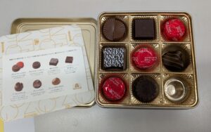 中には9つのチョコレート(一部同じ種類のチョコがあります)が入っています。
