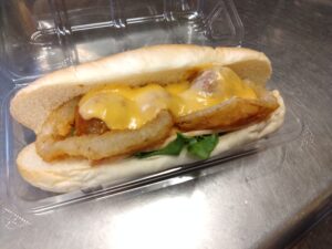 揚げたてのオニオンリングはサクサク。コッペパンのほんのりとした甘みと具材の塩味、そしてチーズと混ざり合ったデミグラスソースが相性抜群!