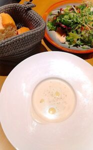 スープ(orサラダ)、お代わり自由のパン、卓上のピッチャー入り(何故か?)ジャスミン茶も