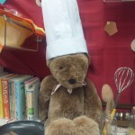 コックさんのような白くて長い帽子をかぶったくまのぬいぐるみ。
